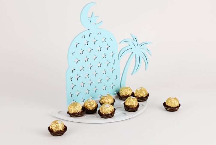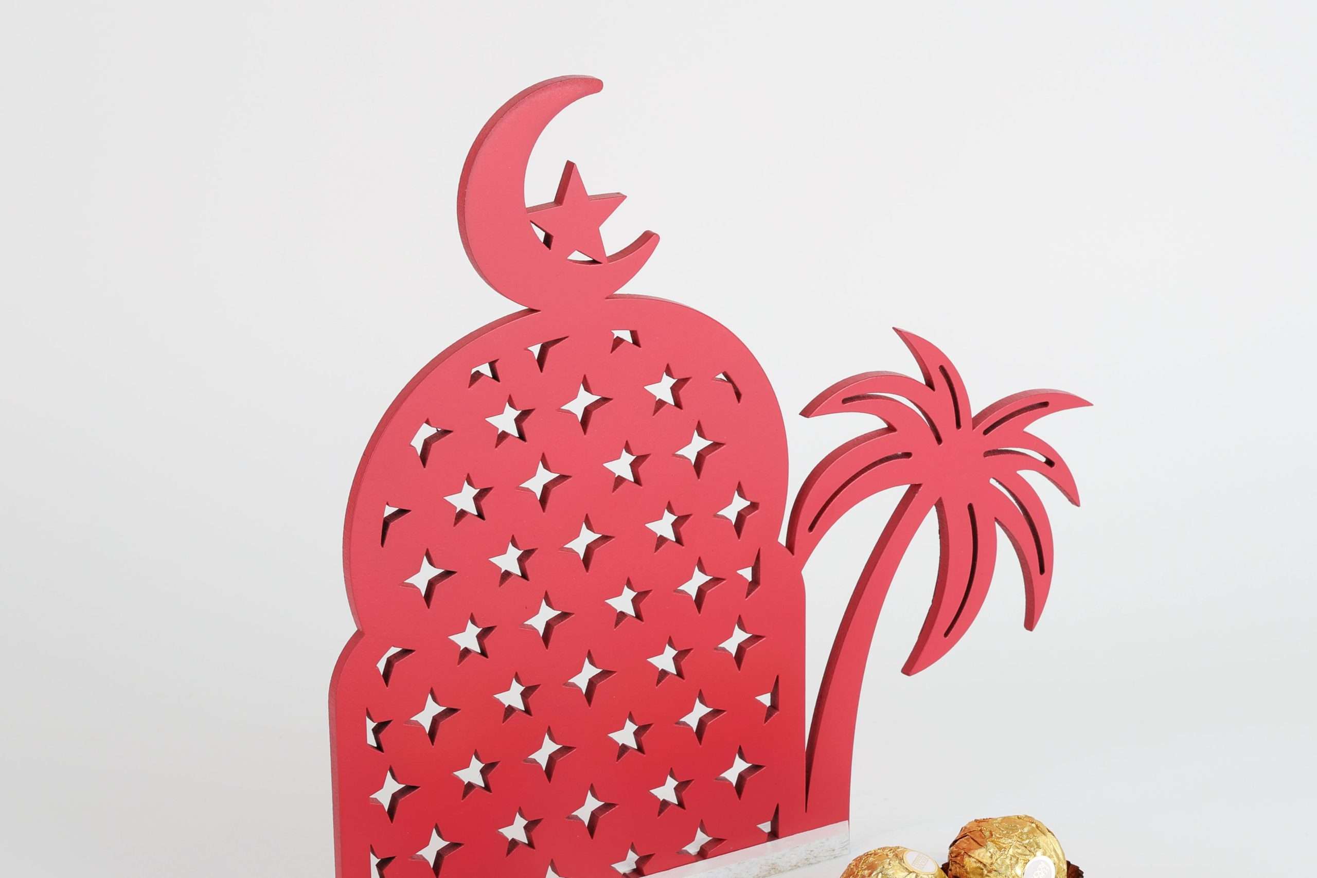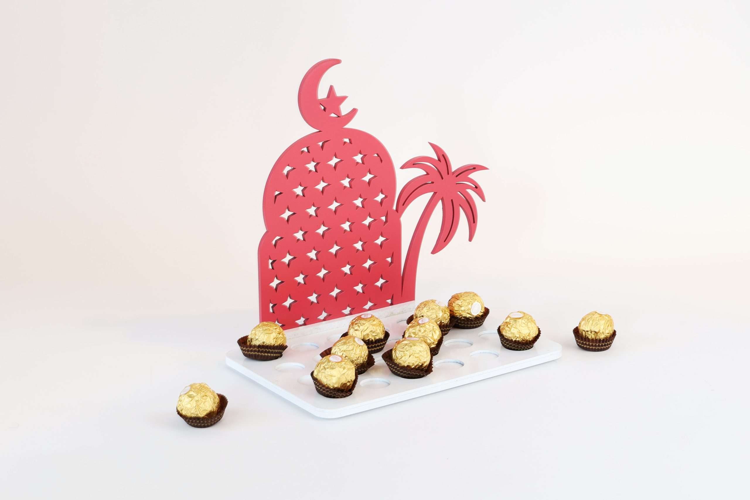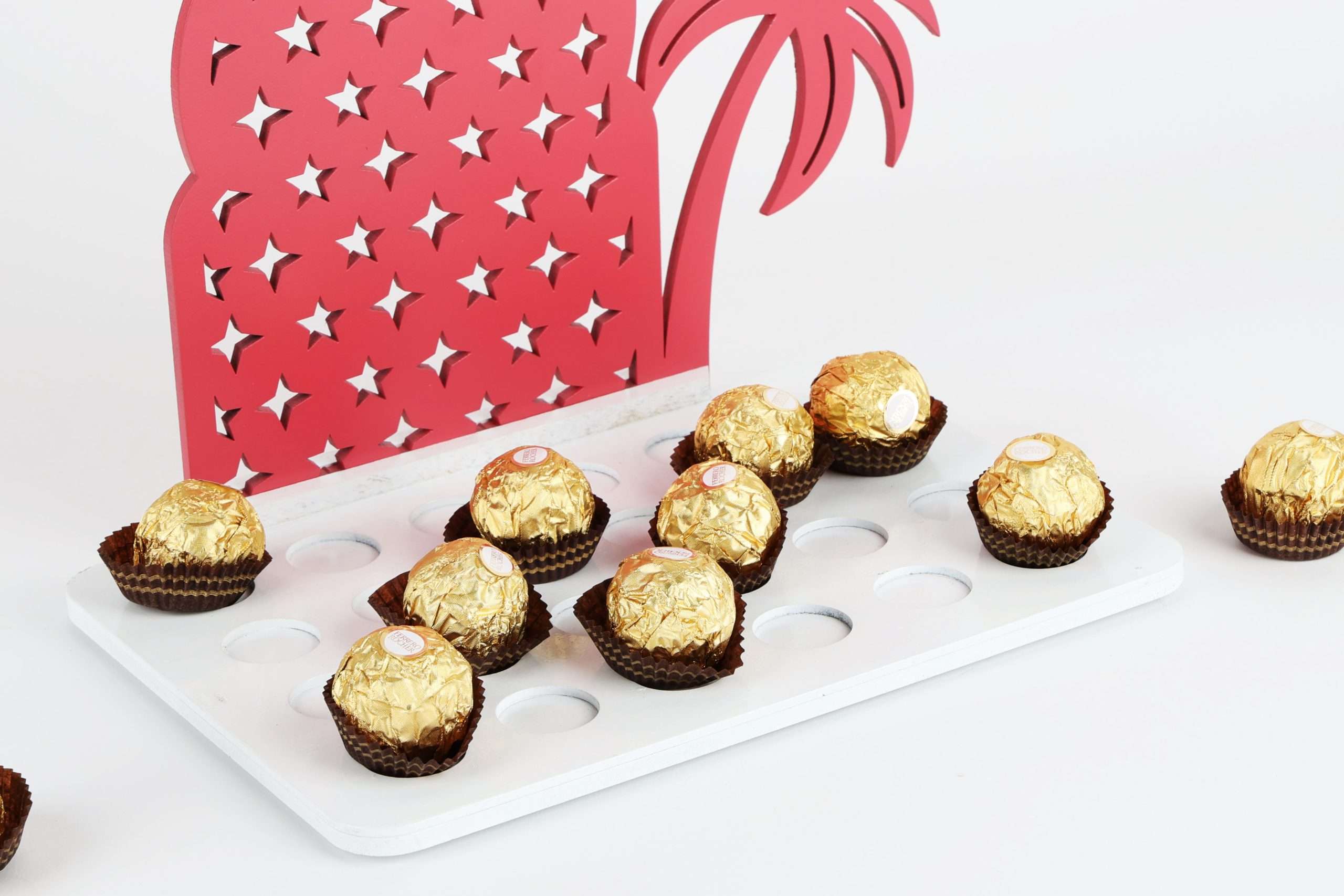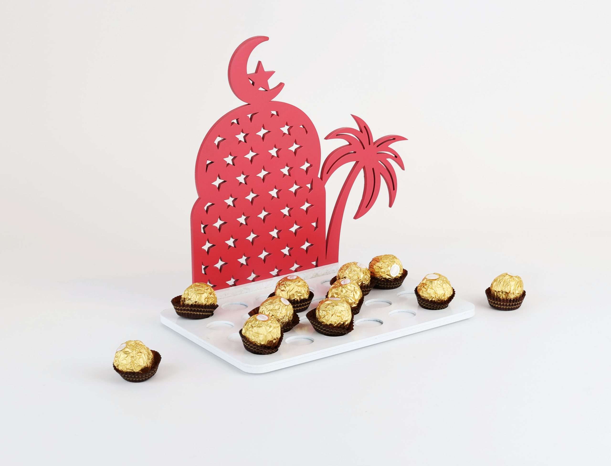 Immerse yourself in the enchanting world of chocolate with our uniquely crafted container featuring a charming moon and coconut tree design. Each glance evokes a sense of romance and indulgence with a captivating red and white finish, creating a visually striking piece that enhances the allure of your sweet treats.